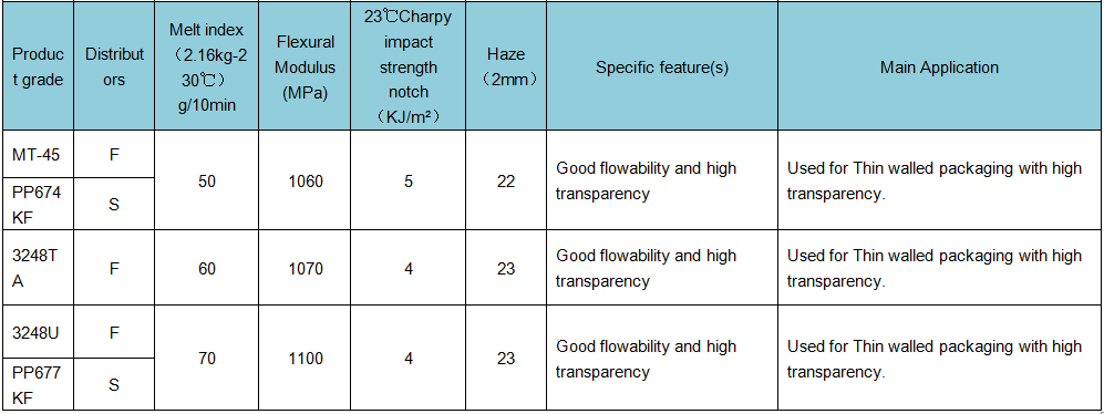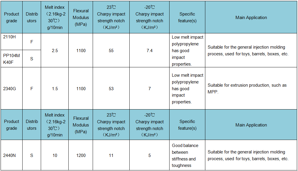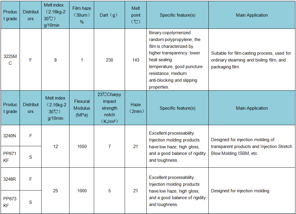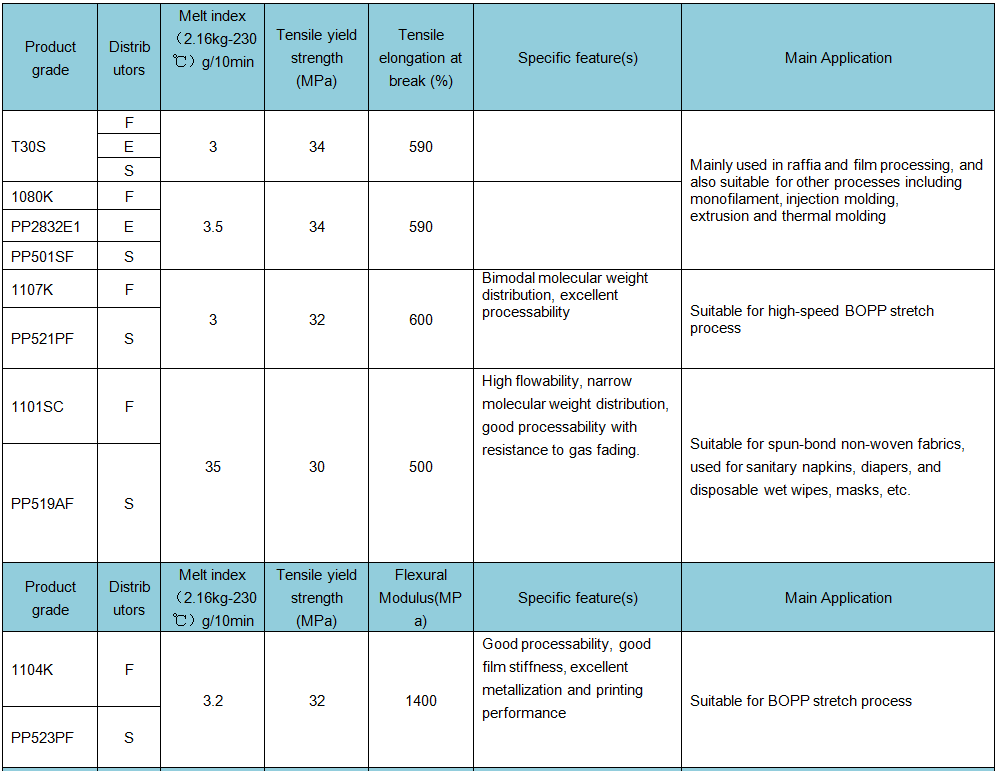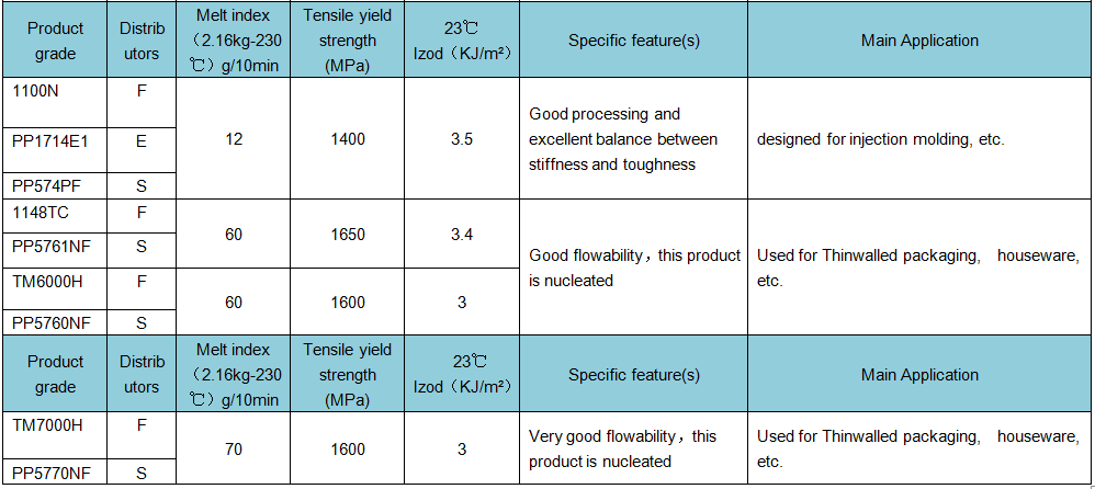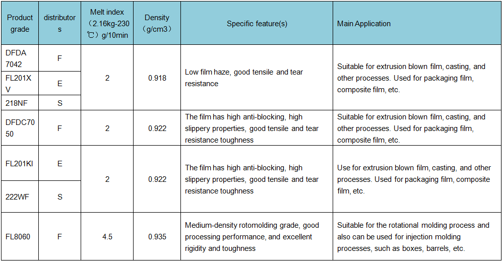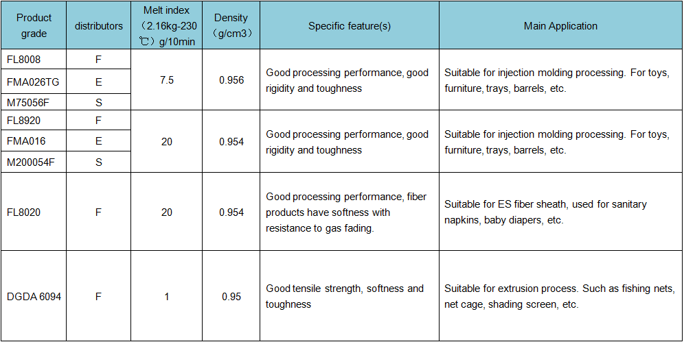Our polyolefin products are lifted by three shareholders including Fujian Petrochemical Company Limited, ExxonMobil China Petroleum & Petrochemical Company Limited, and Saudi Aramco Asia Company Limited according to their proportion of shares, and sold by distributors (Sinopec Chemical Sales Company South China Branch, ExxonMobil Chemical International Services (Shanghai) Limited, SABIC (Shanghai) Trading Co., Ltd.) designated by foregoing shareholders. Should you have any demand, please contact the corresponding shareholders/distributors for each product in the list (F: Fujian Petrochemical Company Limited; E: ExxonMobil Chemical International Services (Shanghai) Limited; S: SABIC (Shanghai) Trading Co., Ltd.).